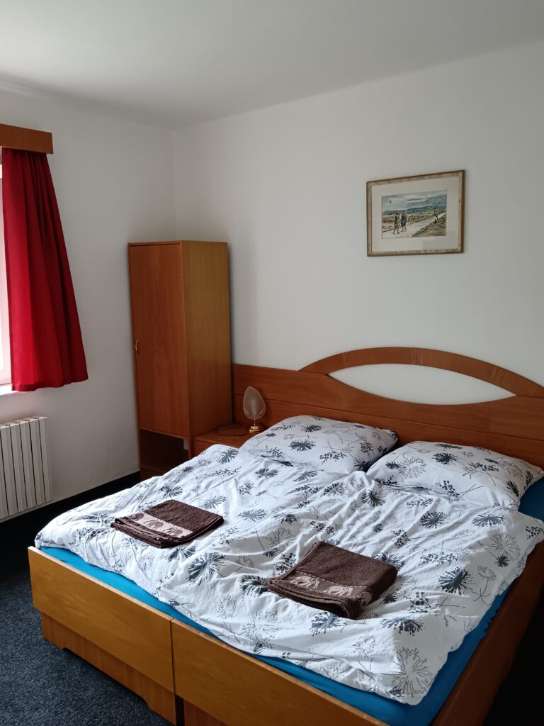 Pohodlné dvoulůžkové pokoje s manželskou postelí (180×200) a úložným prostorem ve 2. patře penzionu . K dispozici je vlastní sociální zařízení se sprchovým koutem, ručníky, povlečení a základní hygienické potřeby (toaletní papír, mýdlo). Hosté bez kuchyňky mohou využívat společnou lednici, varnou konvici a mikrovlnnou troubu které jsou umístěny na chodbě. Součástí ubytování je také společná terasa ve 2. patře s výhledem na Beskydy a Frenštát pod Radhoštěm. Wifi je dostupná zdarma v celém objektu.