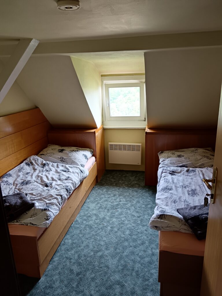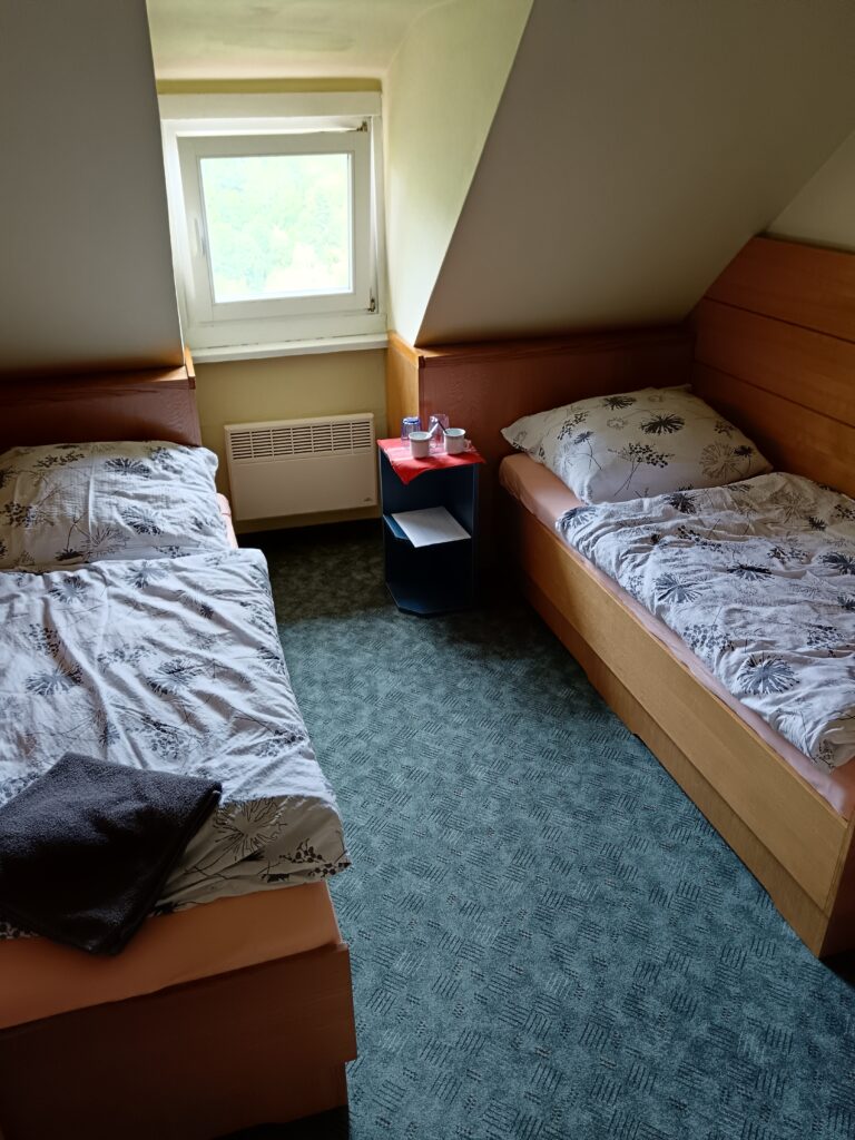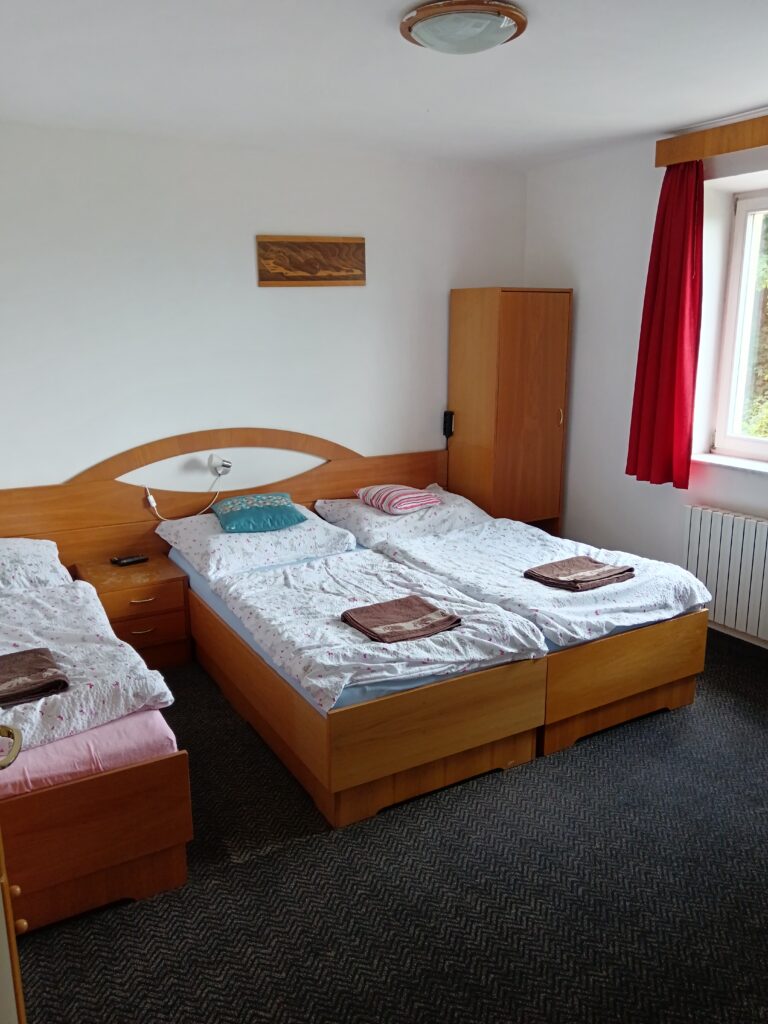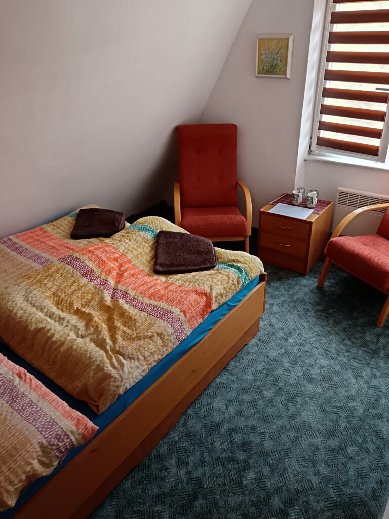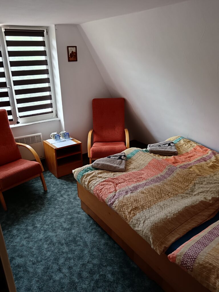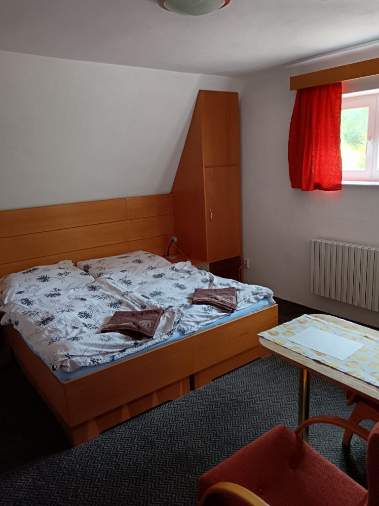 Pokoje se nachází v podkroví ve 3. patře penzionu a jsou jednoduše a pohodlně vybavené. Každý pokoj má manželskou postel (160×200) nebo oddělená lůžka (80×200) a úložný prostor. Sprchový kout a wc jsou sdílené na chodbě. Ručníky a povlečení jsou k dispozici. Hosté bez kuchyňky mohou využívat společnou lednici, varnou konvici a mikrovlnnou troubu. Součástí ubytování je také společná terasa ve 2. patře s výhledem na Beskydy a Frenštát pod Radhoštěm. Wifi je dostupná zdarma v celém objektu. Ideální pro hosty, kteří hledají praktické a cenově dostupné ubytování, jen na přespání.